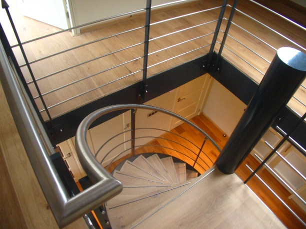 Een spiltrap met whitewash eikenhouten treden en een balustrade van RVS te Malden.