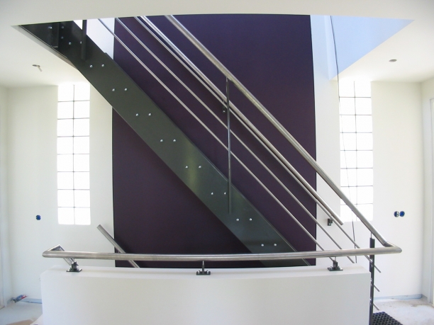 Steektrap met zwarte trapboom en balusters, RVS knieregels en RVS leuning. De leuning van RVS loopt door via de witte muur naar de benedenverdieping.