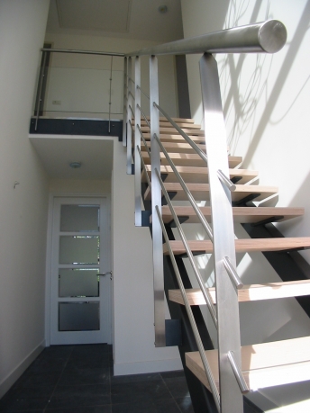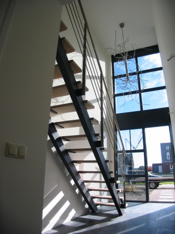 Stijlvolle steektrap met stalen trapboom, houten treden, RVS traphek en bij de vide een bijpassende glazen balustrade in Nistelrode.
