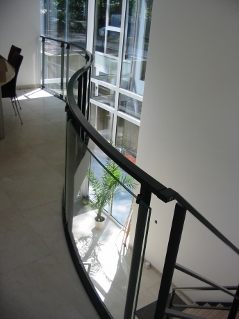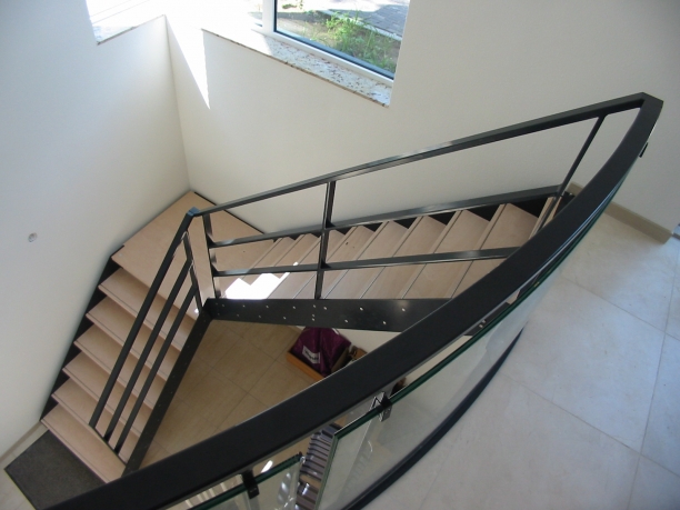 Steektrap met balustrade van zwart gecoat staal. De rechthoekige zwarte balustrade geeft de trap een stoer uiterlijk, hetgeen een mooi contrast oplevert met de verfijnde gebogen glazen balustrade bij de vide.